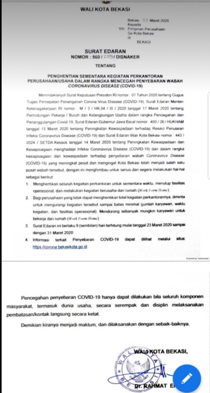 Imbauan agar bekerja dari rumah dan aktivitas perkantoran serta usaha disetop sementara, itu dikeluarkan Wali Kota Bekasi Rahmat Effendi dalam surat edaran bernomor: 560/2209/Disnaker tentang Penghentian Sementara Perusahaan/Usaha Dalam Rangka Mencegah Penyebaran Wabah COVID-19, tertanggal 23 Maret 2020 dan ditandatangani Wali Kota Bekasi Rahmat Effendi.