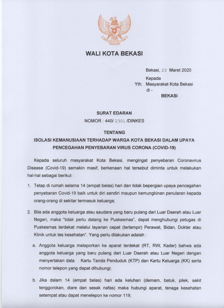 Wali Kota Bekasi Rahmat Effendi telah menerbitkan teknis isolasi tersebut. Dalam Surat Edaran bernomor 440/2301/Dinkes tertanggal 29 Maret 2020 yang ditujukan kepada masyarakat Kota Bekasi terkait Isolasi kemanusiaan Terhadap Warga Kota Bekasi Dalam Upaya Pencegahan Virus Corona (Covid-19). Berikut isi edaran tersebut: