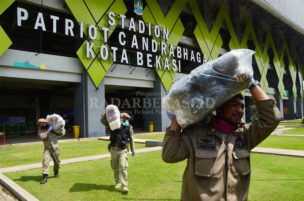 Pantauan Radar Bekasi, Selasa (14/4) sejumlah bahan pokok untuk bantuan warga dari Pemerintah Kota Bekasi sudah sebagain sudah didistribusikan ke posko penanganan Covid-19 Stadion Patriot Candrabhaga Kota Bekasi.(pay)