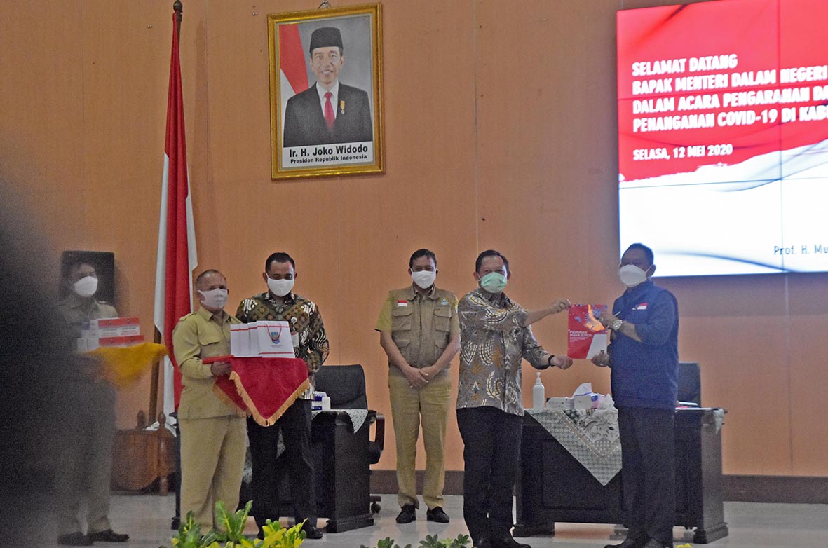 Disela kunjungan kerja Mendagri ke Kabupaten Bekasi, diakhiri dengan pemberian bantuan Kemendagri berupa masker sebanyak 7.500 pcs dan hand sanitizer 1.200 botol, serta buku pedoman manajemen bagi Pemerintah Daerah.(and/adv)