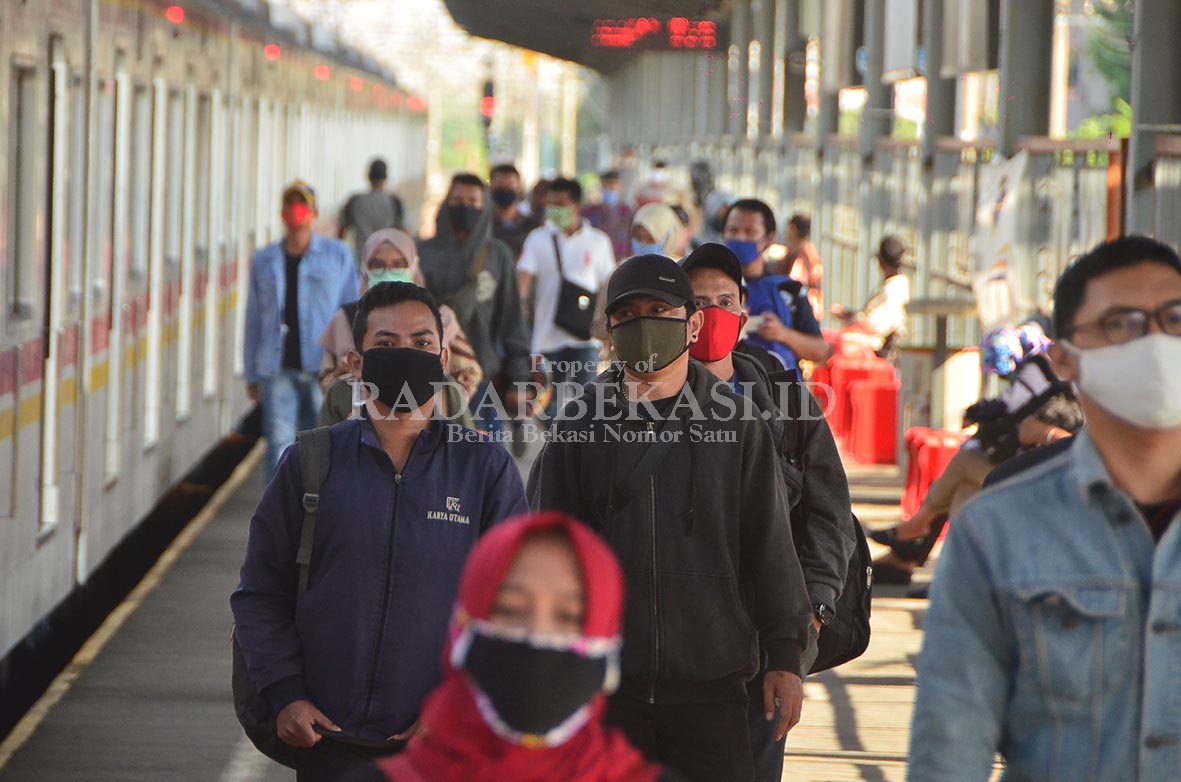 ILUSTRASI: Penumpang ketika berjalan di peron Stasiun Bekasi belum lama ini. Jumlah penumpang yang menunggu di peron dibatasi hanya 250 orang. RAIZA SEPTIANTO/RADAR BEKASI