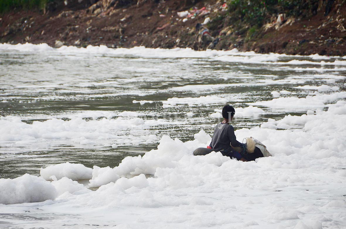 TERCEMAR: Warga mencari ikan di aliran Kali Bekasi yang mengeluarkan buih dan aroma tidak sedap di Kawasan Bekasi Selatan, Rabu (24/6). Pencemaran di Kali Bekasi terus berulang, sejumlah pihak mendesak adanya penanganan serius. RAIZA SEPTIANTO/RADAR BEKASI.