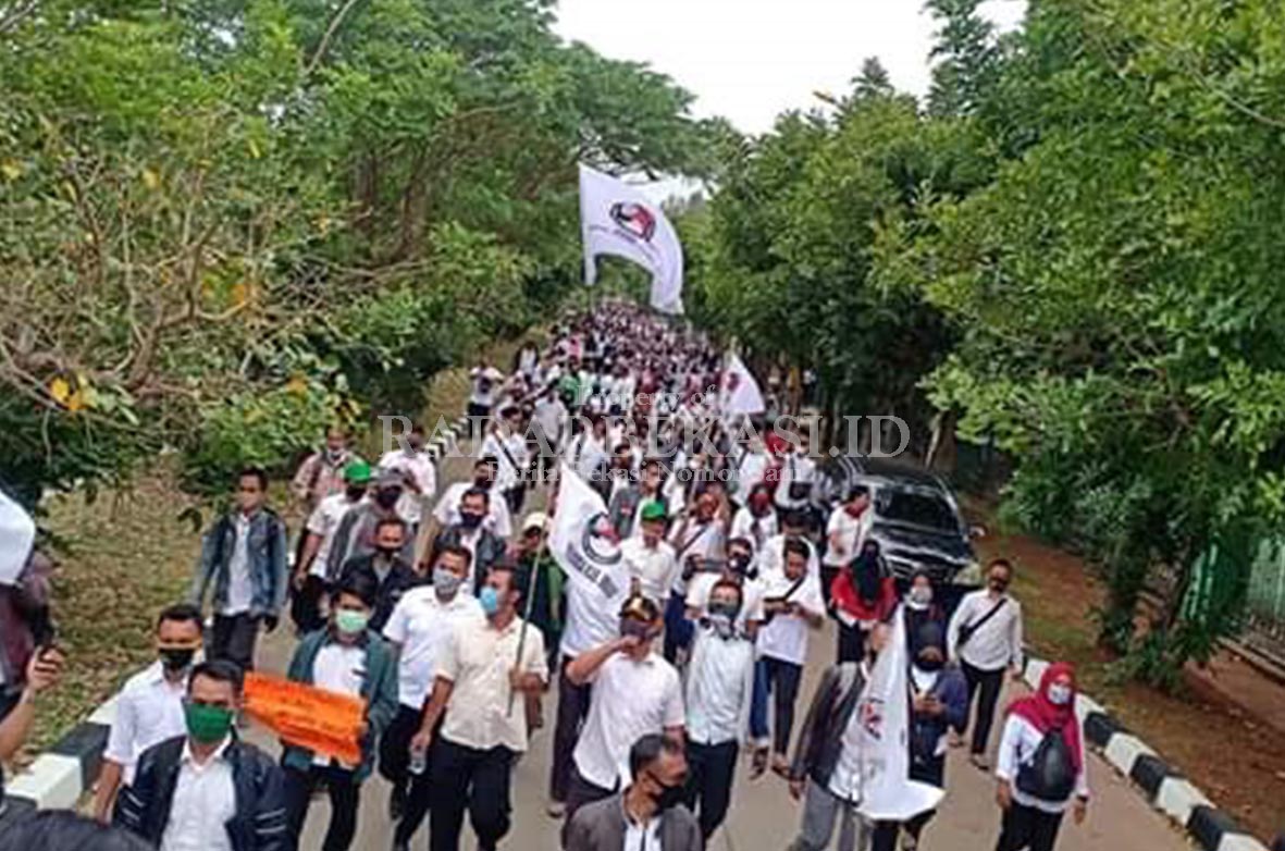 PENUHI JALAN: Ribuan guru honorer yang melakukan aksi unjuk rasa memenuhi jalan saat menyambangi rumah dinas Bupati Bekasi, Eka Supria Atmaja, Rabu (15/7). AND/RADAR BEKASI