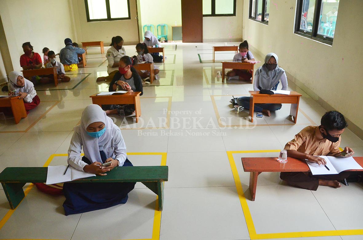 Belasan meja belajar disusun di aula kelurahan, dengan jarak sekitar satu meter. Sejumlah siswa mengerjakan tugas yang diberikan oleh guru melalui telepon pintarnya. Salah satunya Nanda Alifa, siswa kelas V SD tersebut datang diantar ayahnya. “Kadang-kadang dikasih soal lewat WA (Whatsapp), kadang-kadang (disuruh) ngerjain tugas yang ada di buku,” ungkapnya di dalam ruang aula kelurahan Jatirahayu, Kecamatan Pondok Melati, Kota Bekasi, Selasa (28/7).