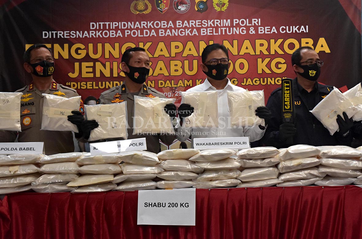RADARBEKASI.ID, BEKASI – Direktorat Tindak Pidana Narkoba Bareskrim Polri, Polda Bangka Belitung dan Bea Cukai mengungkap peredaran narkotika jenis Sabu seberat 200 Kilogram yang berasal dari jaringan internasional. Narkoba yang akan diedarkan di Indonesia tersebut, digagalkan di Desa Sukaresmi Cikarang Selatan Kabupaten Bekasi.