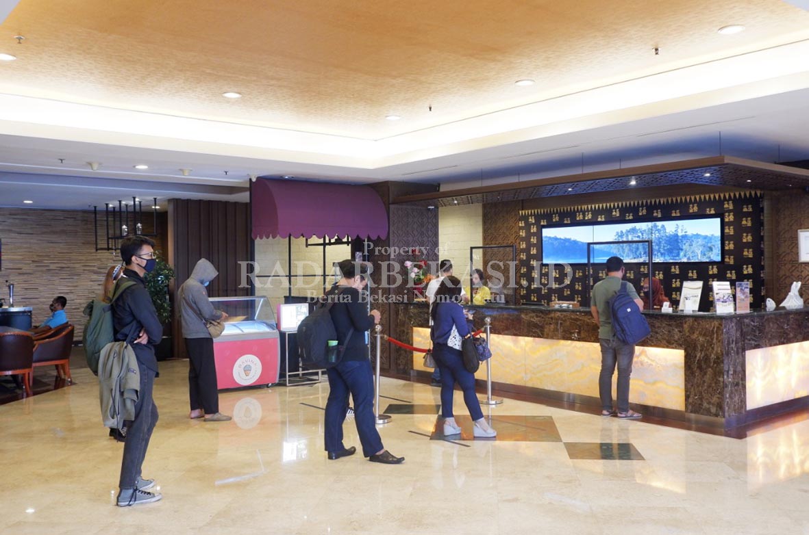 Pantauan Radar Bekasi, memasuki area hotel, pengunjung diwajibkan untuk mengenakan masker dengan sempurna, mencuci tangan, dan menggunakan hand sanitizer yang telah disiapkan, dan mengukur suhu badan. Dia area loby hotel, penampakan tidak terlihat ramai dengan para pengunjung seperti biasa, hanya terlihat segelintir pengunjung duduk di area terpisah.
