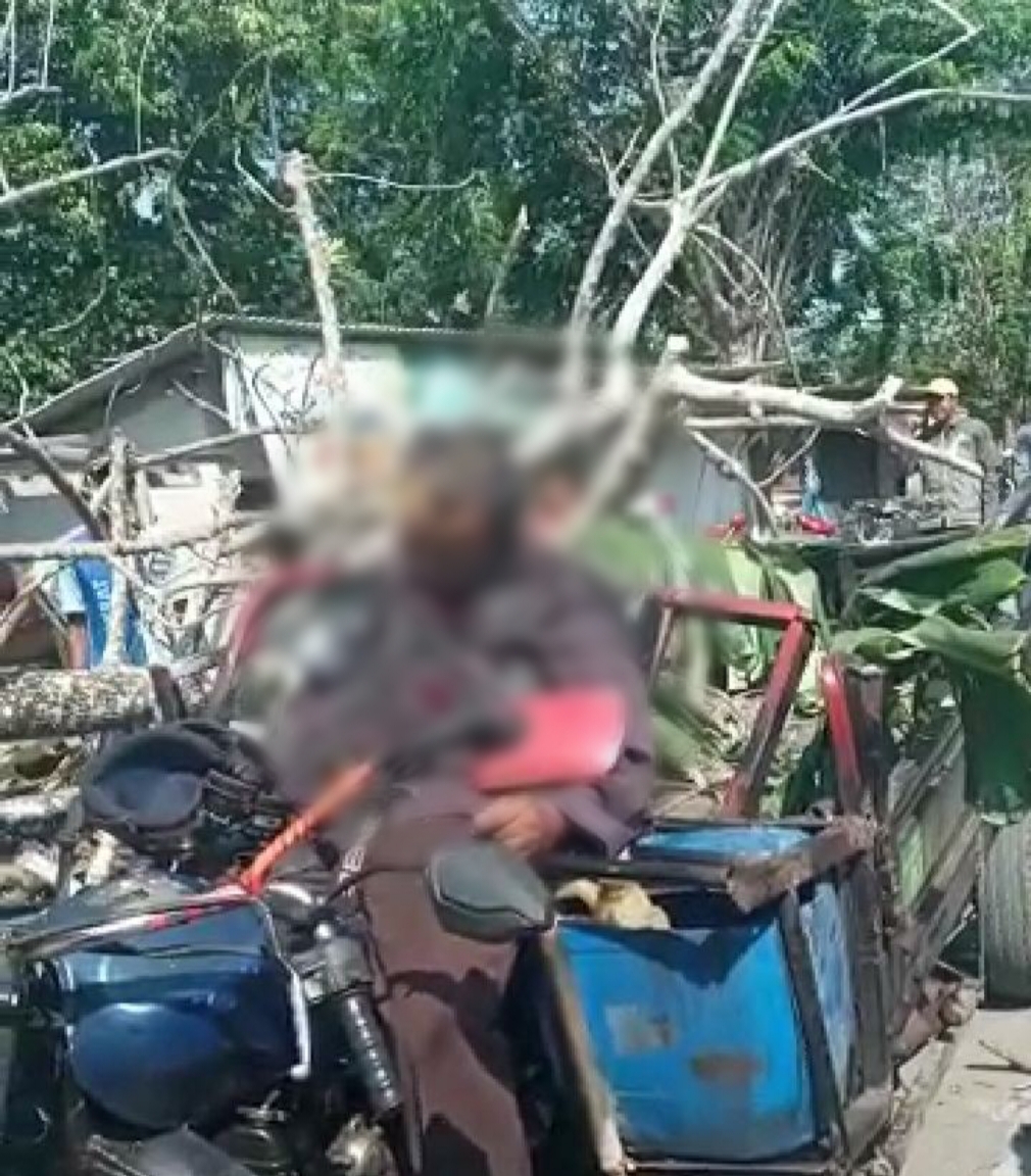 Setibanya di lokasi, korban yang mengendarai sepeda motor roda tiga berwarna biru ini kondisinya sudah tertimpa pohon. Dirinya mengaku, evakuasi korban cukup lama. Pasalnya, pohon yang menimpa korban cukup besar.