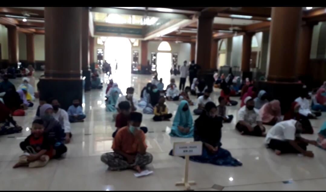 BEKASI, RADARBEKASI.ID – Pengurus Masjid Agung Albarkah Kota Bekasi menyalurkan santunan kepada 300 anak yatim, Sabtu (5/9/2020). Prosesi penyaluran menggunakan protokol kesehahatan.