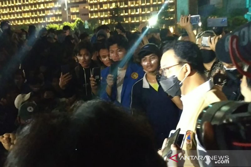Gubernur DKI Jakarta Anies Baswedan menemui massa penolak UU Cipta Kerja di Kawasan Bundaran HI, Kamis malam, untuk mengingatkan kepada mereka agar menyuarakan keadilan dengan tertib.