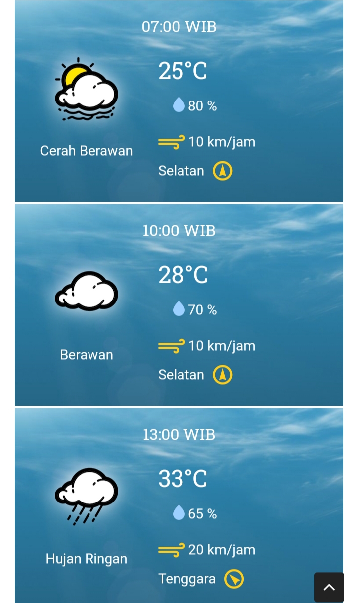 Dilansir melalui situs resmi BMKG, terkait prakiraan cuaca hari ini akan diawali pada waktu pagi yang cerah berawan, dengan suhu udara 25-28 derajat celsius dari pukul 07.00 hingga 10.00. Namun, di siang hari dan sore diprediksi hujan akan turun dengan intensitas ringan.