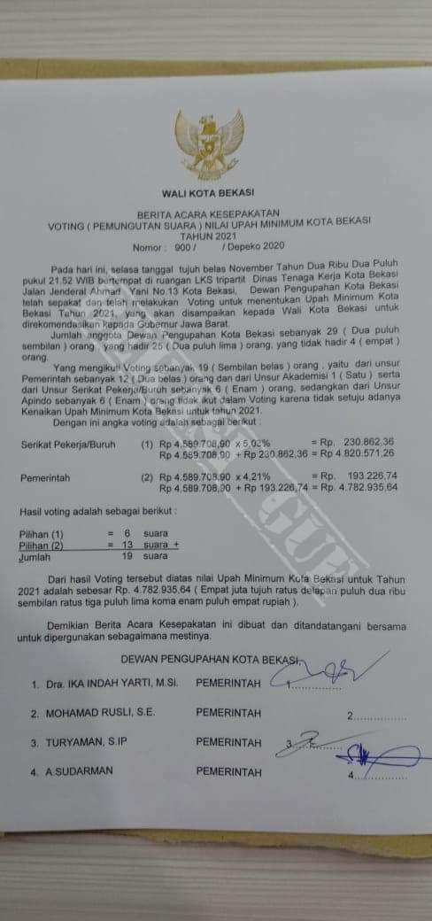 Hasil rapat tersebut diketahui berdasarkan berita acara voting nilai UMK Kota Bekasi Tahun 2021 yang beredar di media sosial pagi ini, Rabu 18 November 2020.