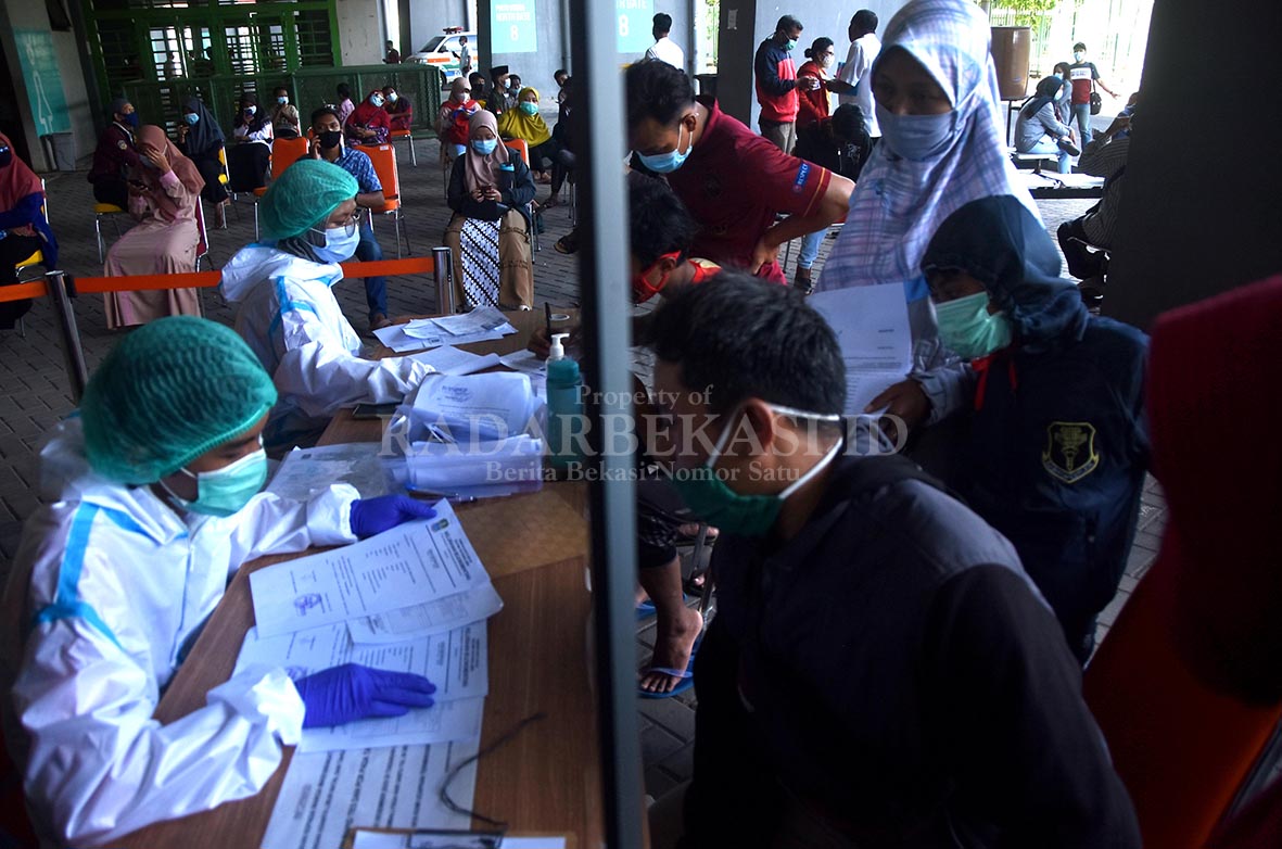 RAMAI: Sejumlah warga mengantre melakukan rapid test di Stadion Patriot Candrabhaga Kota Bekasi usai libur tahun baru, Senin (4/1). RAIZA SEPTIANTO/RADAR BEKASI.
