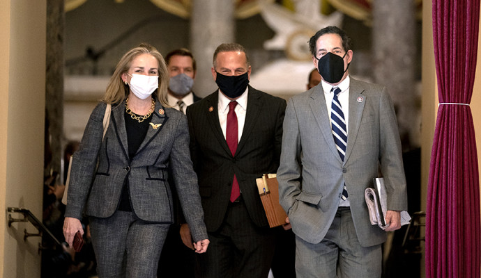 PENGGAGAS pemakzulan terhadap Trump, (dari kiri) Madeleine Dean, Eric Swalwell, David Cicilline, dan Jamie Raskin di Gedung Capitol, Washington DC (13/1). / Radar Bekasi.