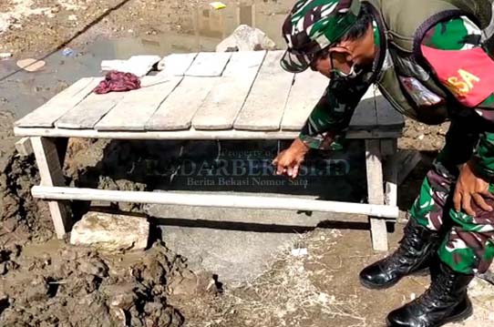 LIHAT LUBANG: Anggota Babinsa Desa Segara Jaya, Peltu Ajasmad, sedang melihat lubang yang mengeluarkan semburan gas, di Kampung Pal Jaya, Desa Segara Jaya, Kecamatan Tarumajaya, Kabupaten Bekasi, Selasa (23/3). PRA/RADAR BEKASI