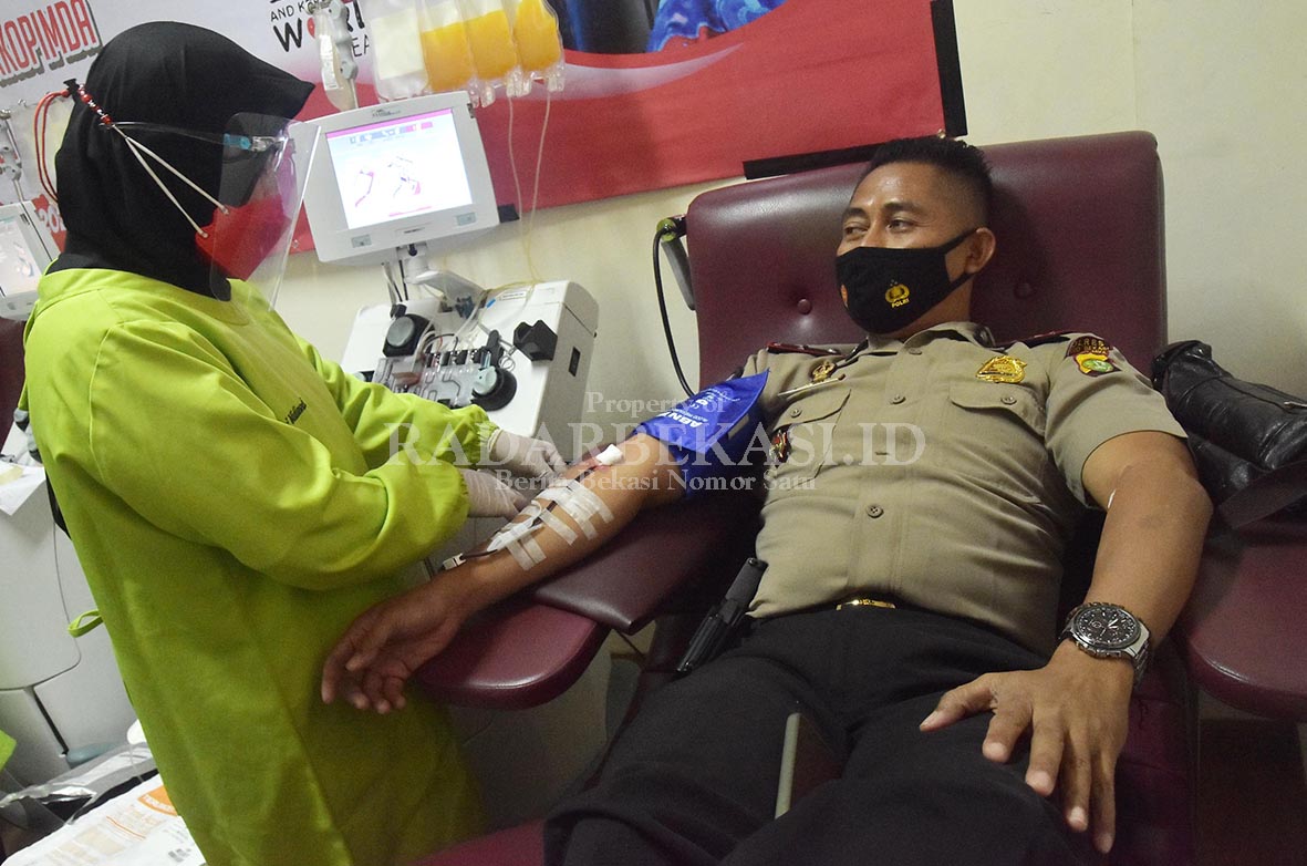 DONOR PLASMA : Seorang anggota polisi mendonorkan darah plasma konvalesen di Kantor Palang Merah Indonesia (PMI) Kabupaten Bekasi, Rabu (16/6). ARIESANT/RADAR BEKASI