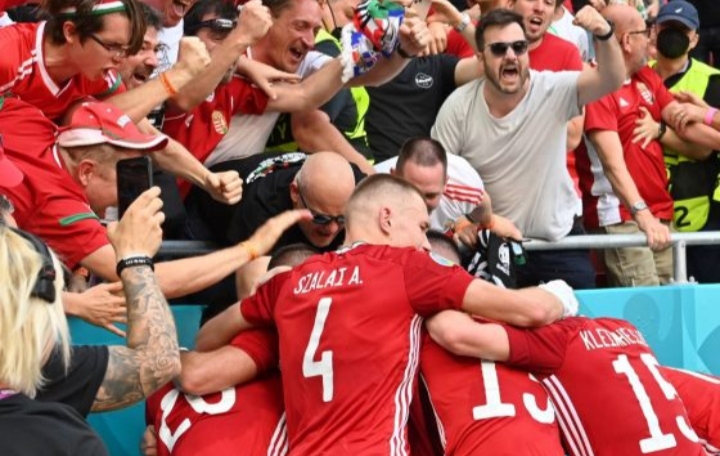 Para pemain dan pendukung Hungaria merayakan gol yang dicetak Attila Fiola ke gawang Prancis pada laga kedua Grup F Euro 2020 (19/6). (TIBOR ILLYES / POOL / AFP)