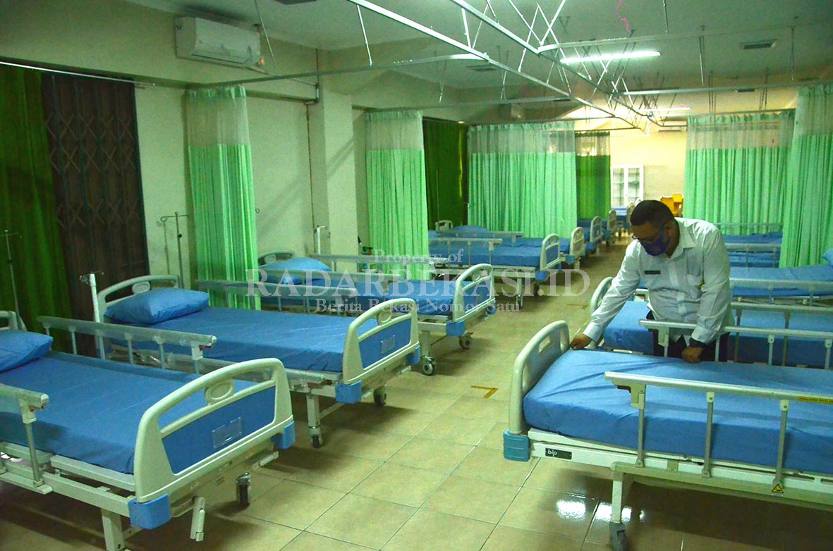 Illustrasi : Pegawai Pemkot Bekasi membersihkan ruang perawatan untuk pasien Covid-19 di Stadion Patriot Candrabhaga Kota Bekasi, Selasa (8/9). Pemkot Bekasi menyiapkan 100 tempat tidur pasien Covid-19 untuk antisipasi jika daya tampung rumah sakit tidak mencukupi. RAIZA SEPTIANTO/RADAR BEKASI