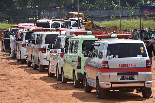 Pantuan Radar Bekasi kemarin, belasan mobil ambulans pembawa jenazah Covid-19 terus berdatangan ke Tempat Pemakaman Umum (TPU) Padurenan, Mustikajaya Kota Bekasi. Beberapa orang tampak sedang menunggu giliran pemakaman jenazah keluarga mereka. Sebagian duduk-duduk di dekat pintu masuk pemakaman, sebagian lagi menunggu di mobil pribadi.