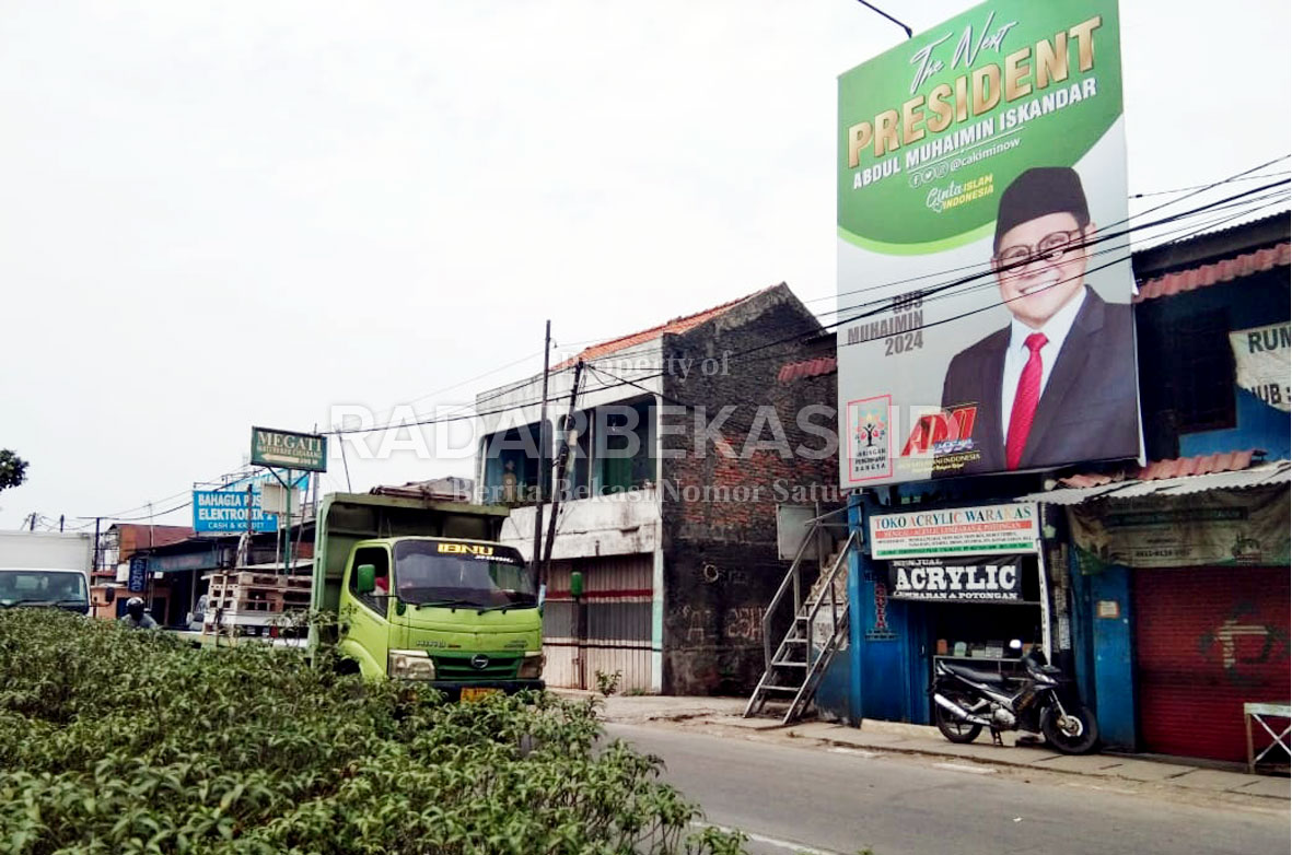 DUKUNGAN – Spanduk ketua umum Partai Kebangkitan Bangsa (PKB), Abdul Muhaimin Iskandar, yang terpasang di Jalan Raya RE Martadinata, Cikarang Utara. ISTIMEWA/RADAR BEKASI