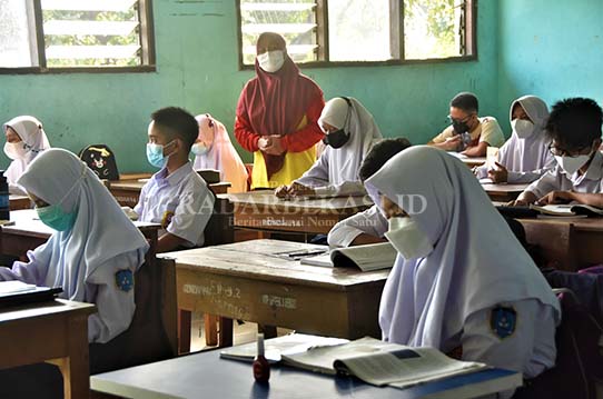 BERI MATERI : Guru memberikan materi pelajaran saat pembelajaran tatap muka di SMP N 3 Bekasi, Kota Bekasi, Rabu (1/9). Sebanyak 66 SMP Se-Kota Bekasi menggelar pembelajaran tatap muka terbatas dengan menerapkan protokol kesehatan yang ketat. RAIZA SEPTIANTO/RADAR BEKASI