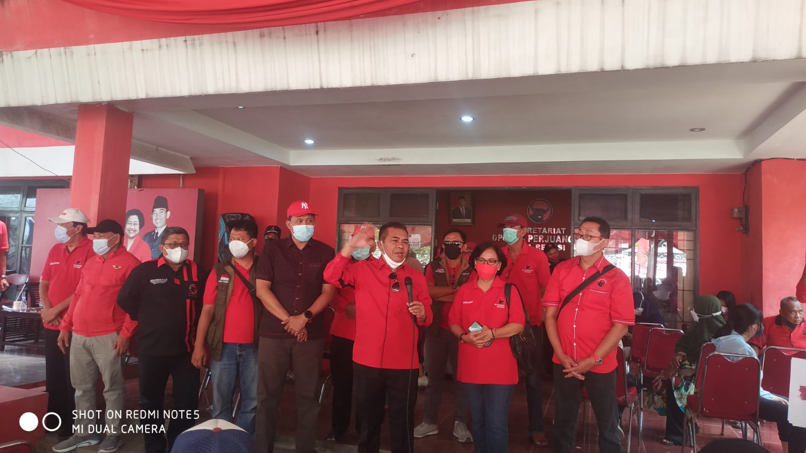 SAMBUTAN : Ketua DPP PDIP Sukur H Nababan saat memberikan sambutan dalam kegiatan vaksinasi di kantor DPC PDIP Kota Bekasi, kemarin.HARI FAUZAN/RADAR BEKASI