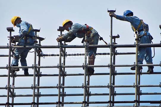 PROSES PEMBANGUN : Para Tenaga Kerja Asing (TKA), sedang mengerjakan pembangunan Kereta Cepat Jakarta-Bandung, di Kawasan Bekasi Timur, Kota Bekasi, belum lama ini. RAIZA SEPTIANTO/RADAR BEKASI