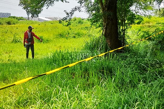Dari pantauan di lokasi penemuan mayat, jarak dari pemukiman warga cukup jauh, dan masih penuh rumput. Saat ini, lokasi penemuan itu sudah dipasang garis polisi.