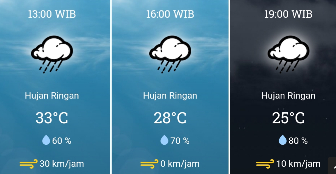 Hujan dengan intensitas ringan akan turun pada pukul 07.00 dan cuaca berawan akan terjadi pada pukul 10.00. Setelah itu, pada siang hari pukul 13.00 hujan dengan intensitas ringan kembali turun pada sore pukul 16.00 dan menjelang malam pukul 19.00.