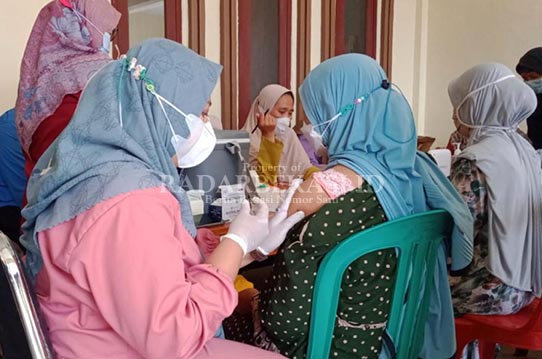 VAKSIN BOOSTER: Tenaga kesehatan (nakes) menyuntikkan vaksin ketiga (booster) kepada warga, di Desa Sukamukti, Kecamatan Bojongmangu, Kabupaten Bekasi. IST/RADAR BEKASI