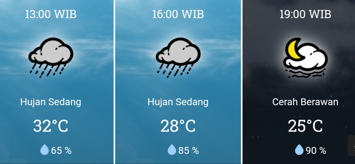 Badan Meteorologi Geofisika dan Klimatologi memprakirakan, hujan ringan dimulai sejak pukul 04.00 dinihari. Dilanjut pada pukul 07.00 lalu pukul 10.00 Hujan intensitas sedang terjadi pukul 13.00 dan pukul 16.00. Cuaca cerah berawan baru akan terjadi pukul 19.00 dan 22.00.