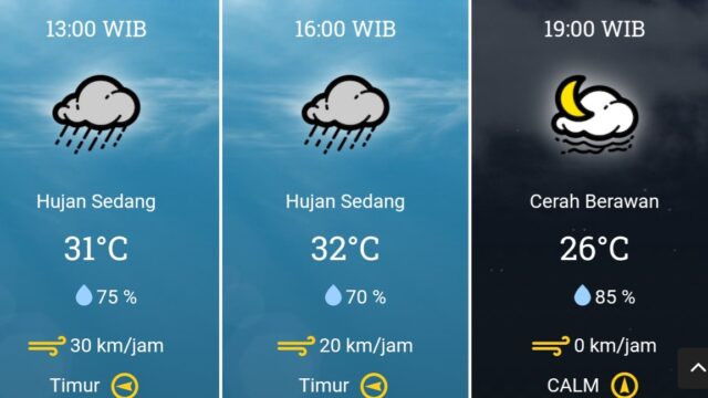 Hujan dengan intensitas sedang akan turun di Bekasi pada siang hari pukul 13.00 dan sore pukul 16.00. Sedangkan cuaca di malam hari berlangsung cerah berawan pada pukul 19.00 dan 22.00.