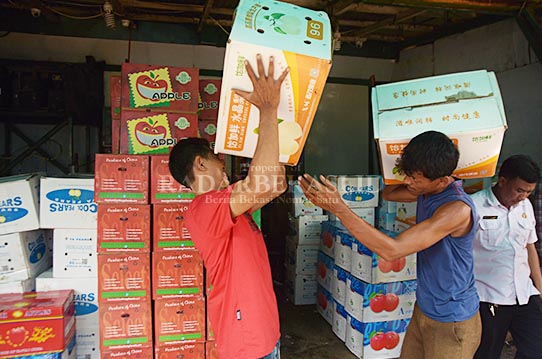 ARIESANT/RADAR BEKASI ILUSTRASI – Sejumlah pedagang Pasar Cibitung saat mengangkut buah impor. Pedagang pasar induk Cibitung menolak biaya penjualan 11 persen