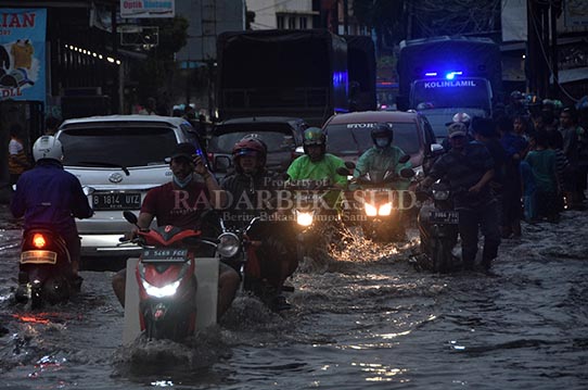 Pantauan Radar Bekasi, banjir juga nampak di kawasan Kaliabang Tengah, Kecamatan Bekasi Utara sore kemarin.