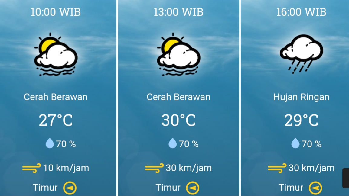 – Pukul 19.00 (berawan, suhu 26°, kelembaban 85%, kecepatan angin 10 km/jam)
