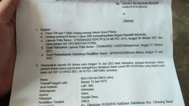 RADARBEKASI.ID, CIKARANG UTARA – Beredar, surat dari Polres Metro Bekasi yang akhirnya menetapkan Kepala Desa Sukadanau berinisial M (50) tersangka tindak pidana perzinahan. M diduga melakukan perzinahan di Swiss Bell In Hotel Cibitung, Juli 2021 lalu.