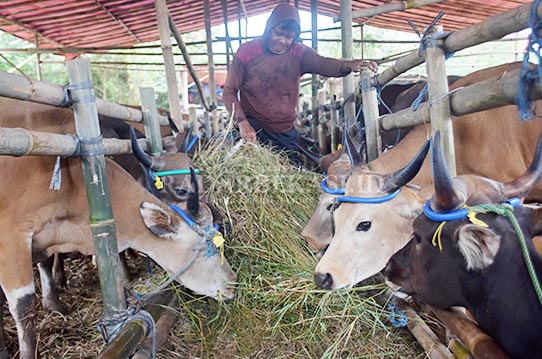 Illustrasi : Pedagang memberikan pakan sapi qurban di Jalan Diponegoro Tambun Selatan Kabupaten Bekasi, Selasa (14/6). Ratusan hewan kurban di Kabupaten Bekasi terjangkit PMK. ARIESANT/RADAR BEKASI