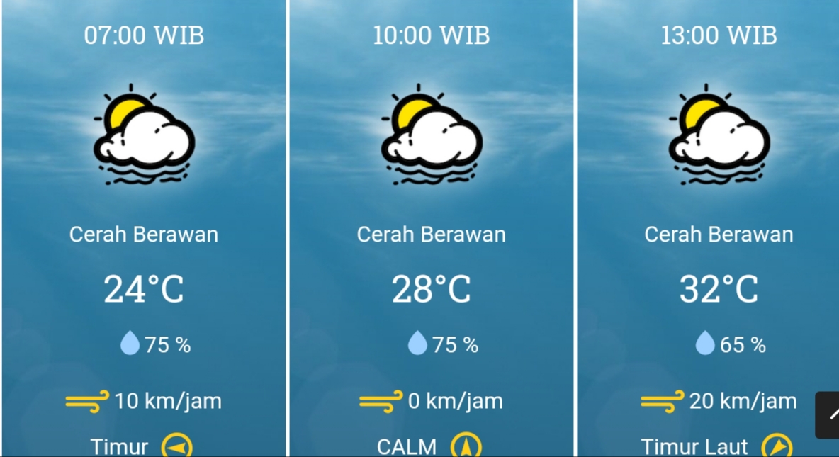 – Pukul 07.00 (cerah berawan, suhu 24°, kelembaban 75%, kecepatan angin 10 km/jam)