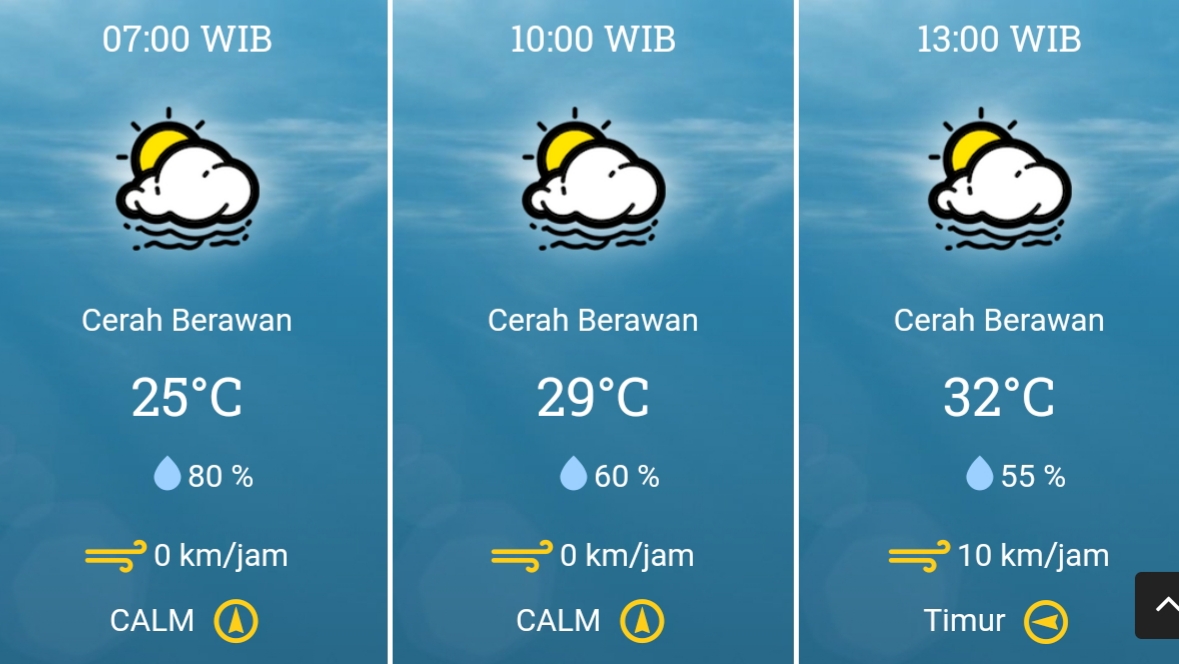– Pukul 13.00 (berawan, suhu 32°, kelembaban 55%, kecepatan angin 10 km/jam)