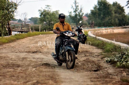JALAN RUSAK : Pengendara melintasi jalan rusak di Desa Pantai Bakti Muaragembong Kabupaten Bekasi, Rabu (20/7). Sepanjang 149 kilometer jalan rusak di Kabupaten Bekasi belum diperbaiki. ARIESANT/RADAR BEKASI