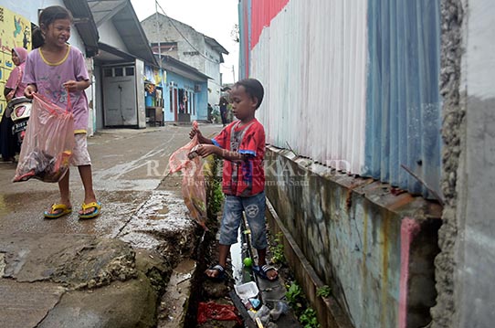 PUNGUT SAMPAH : Seorang anak memungut sampah yang berada di selokan air, di Kampung Ketapang, Desa Kalijaya, Cikarang Barat, Kabupaten Bekasi, Minggu (24/7). ARIESANT/RADAR BEKASI