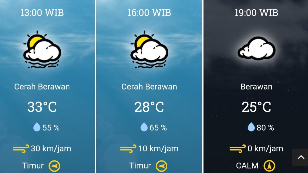 – Pukul 19.00 (berawan, suhu 25°, kelembaban 80%, kecepatan angin 0 km/jam).