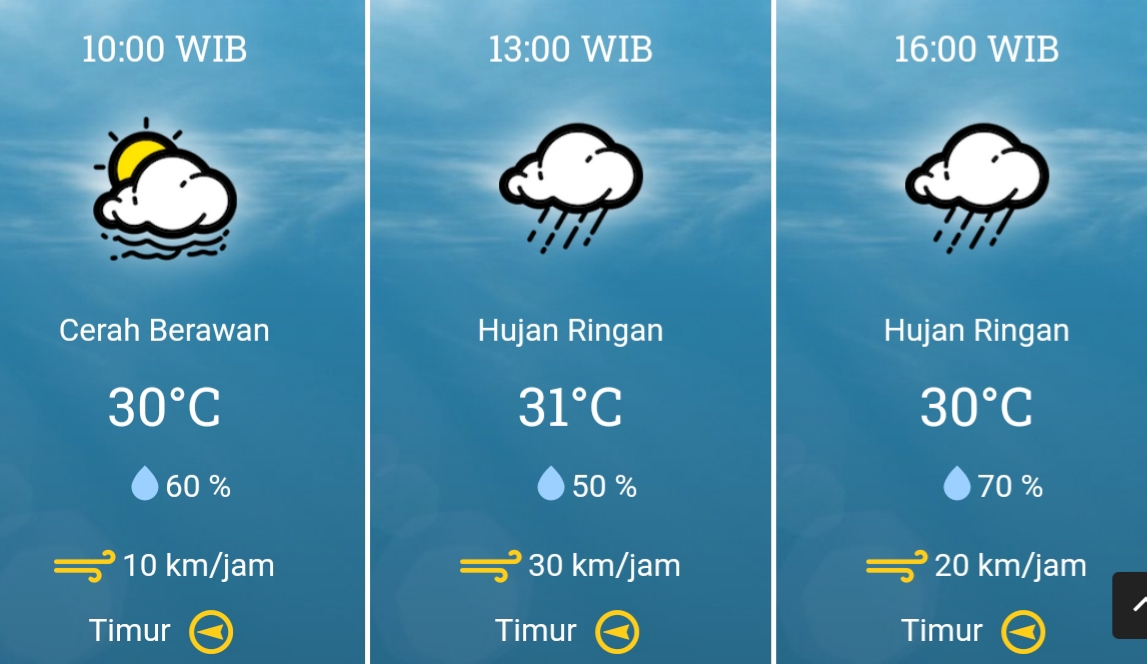 – Pukul 16.00 (hujan ringan, suhu 30°, kelembaban 70%, kecepatan angin 20 km/jam).