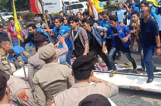 RADARBEKASI.ID, BEKASI – Insiden saling dorong antara petugas dan massa terjadi pada aksi puluhan mahasiswa yang mempertanyakan tidak dialokasikannya anggaran pesantren. Kejadian itu membuat pagar kantor DPRD Kota Bekasi Roboh.