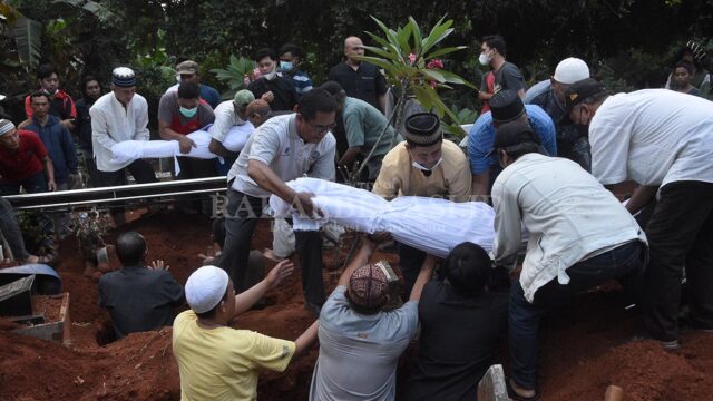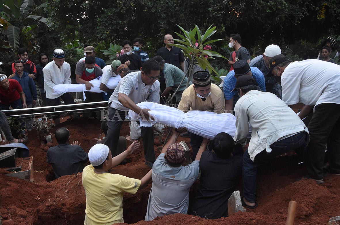 EMAKAMAN : Keluarga memakamkan dua jenazah korban kecelakaan maut di TPU Aster, Kota Baru, Bekasi Barat, Kota Bekasi, Rabu (31/8). Seluruh korban laka dipastikan menerima santunan. RAIZA SEPTIANTO/RADAR BEKASI.