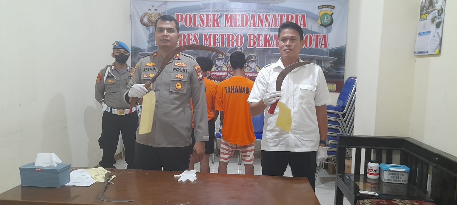 Sementara, 5 orang ditetapkan tersangka tawuran berhasil diamankan aparat Polsek Medansatria. Kelima orang yang ditangkap itu, RN (18), RAG (17), ST (17), MD (17) dan Z (16). Satu di antara tersangka, yaitu ST diketahui sebagai admin sebuah media.
