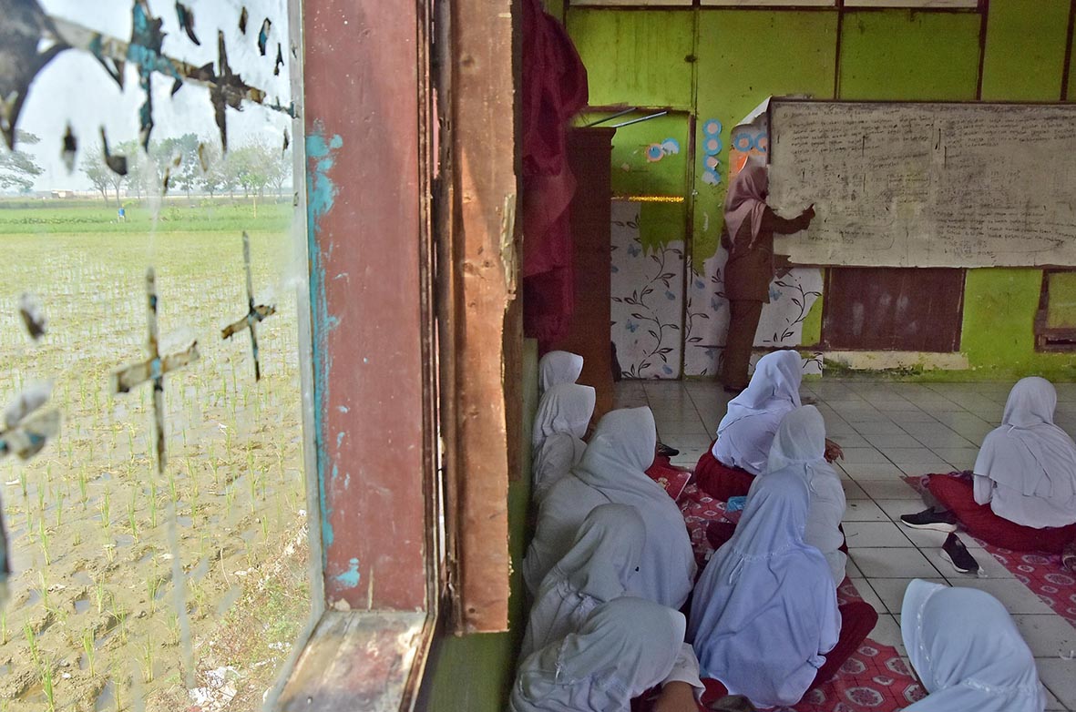 ILUSTRASI: Guru mengajar yang siswanya tanpa menggunakan kursi dan meja di SDN Sukadaya 02 Kecamatan Sukawangi Kabupaten Bekasi, belum lama ini. Sejumlah PR menanti anggota Dewan Pendidikan Kabupaten Bekasi terpilih periode 2022-2027. ARIESANT/RADAR BEKASI