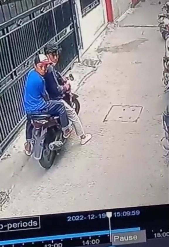 Rekaman kamera CCTV memperlihatkan dua orang pria menggunakan satu sepeda motor.