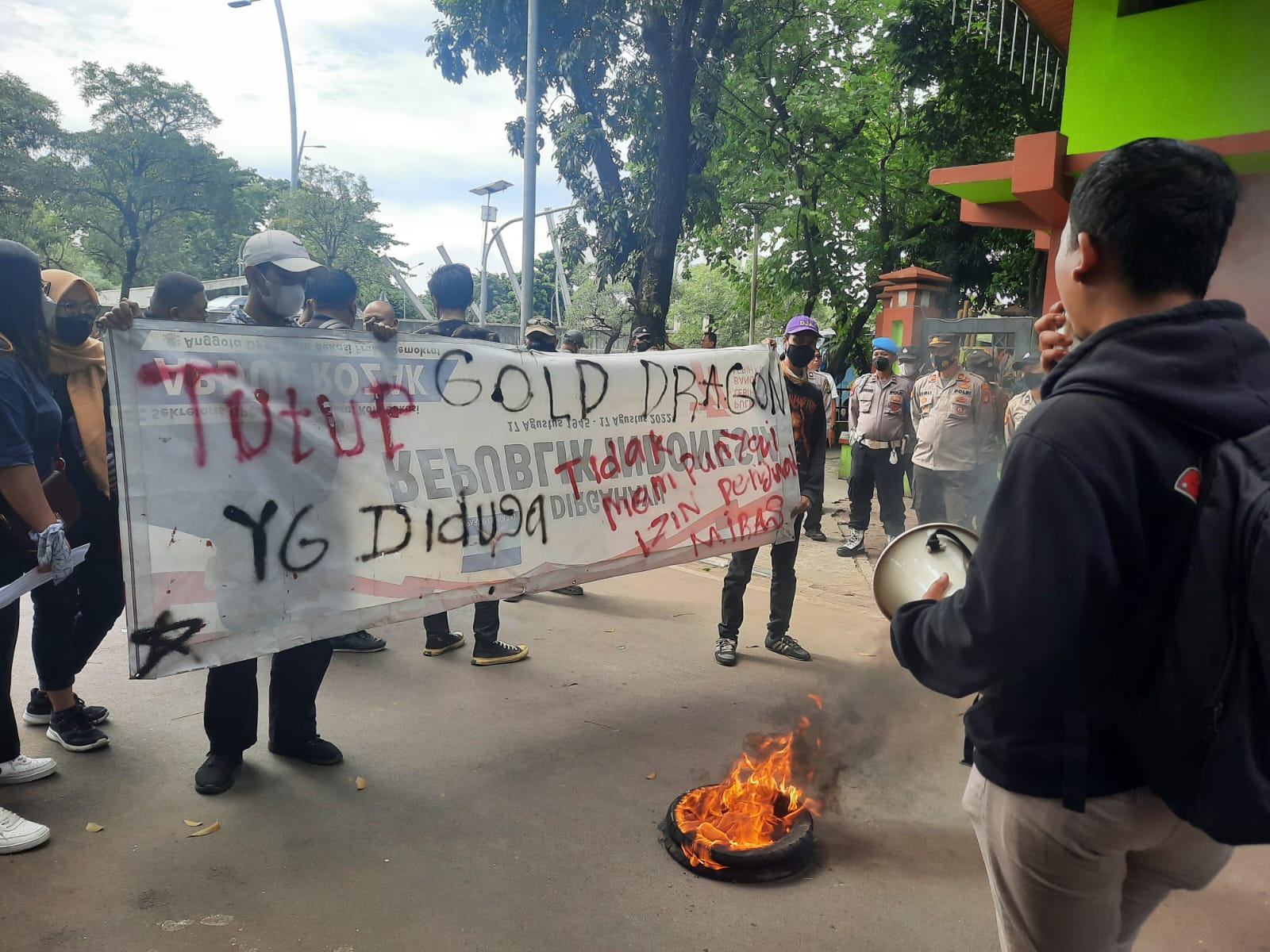 “Dugaan kami timbul karena kelalaian Pemerintah dalam melakukan pengawasan serta pengendalian peredaran minunan keras dan alkohol di Gold Dragon Bekasi,” kata Nicolas T, salah satu orator.