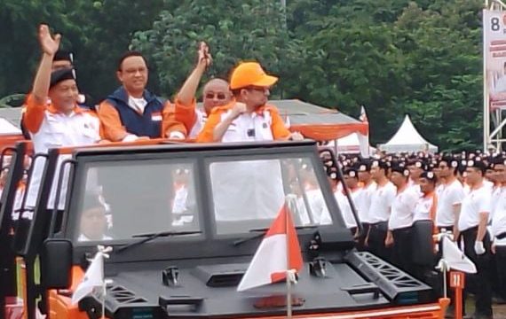 Dr. Salim bersama Ahmad Syaikhu, Habib Aboe, dan Anies Baswedan tampak berkeliling dengan menaiki jip melihat barisan.