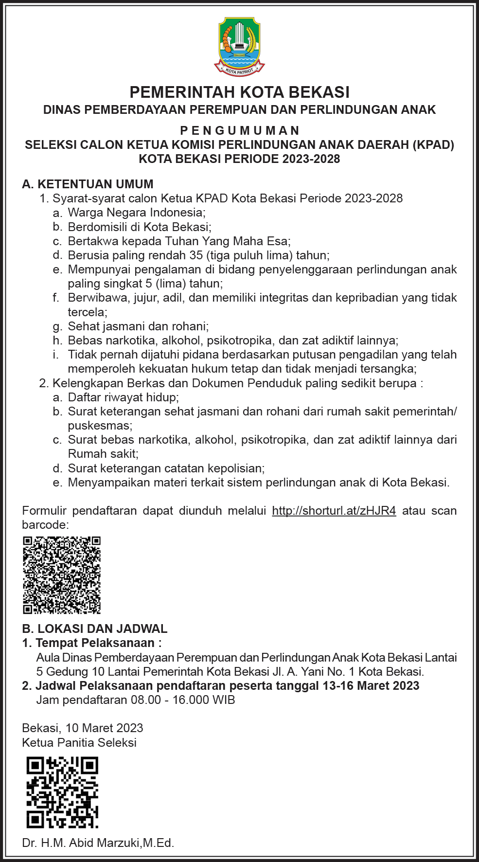 PENGUMUMAN SELEKSI CALON KETUA KOMISI PERLINDUNGAN ANAK DAERAH (KPAD) KOTA BEKASI PERIODE 2023-2028